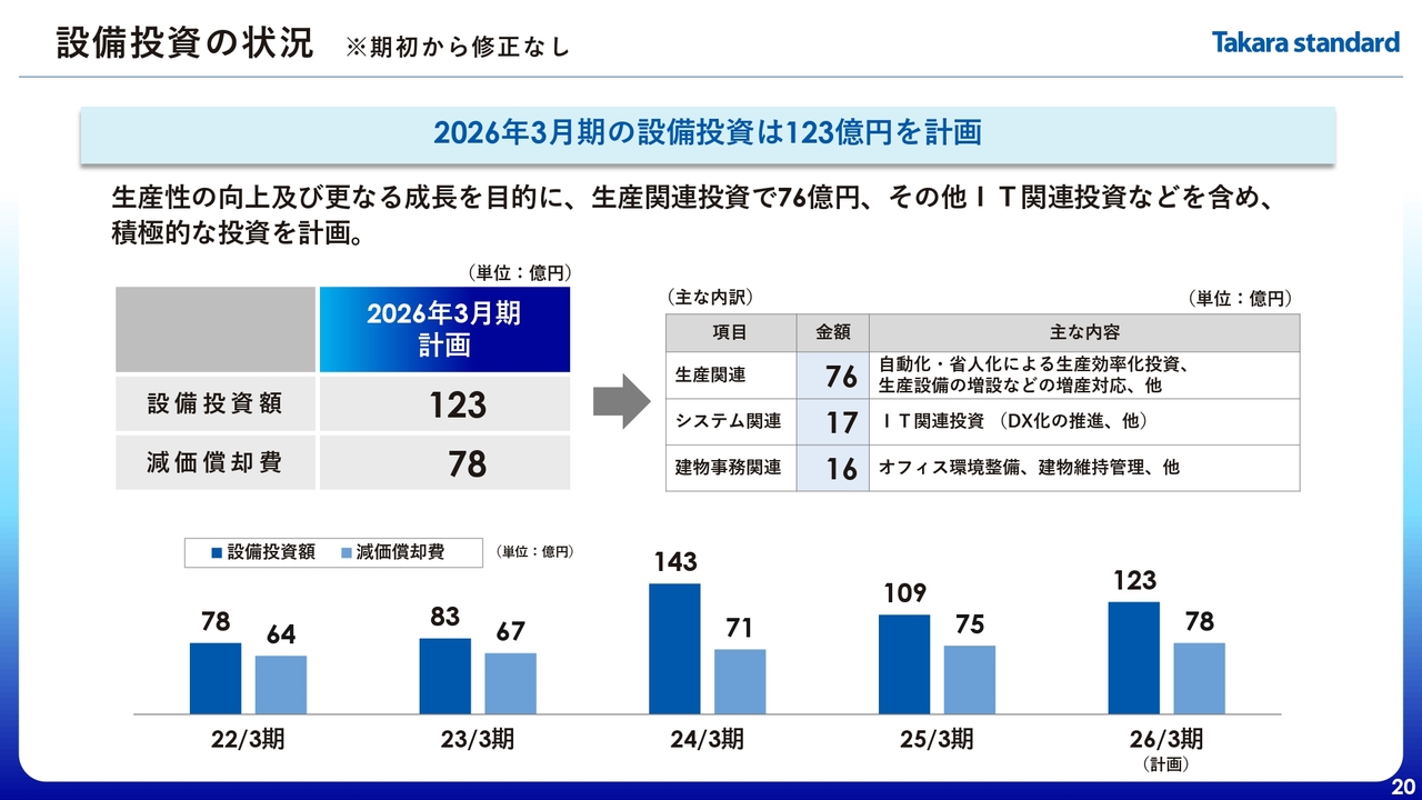 設備投資は期初から修正しておらず、今期は123億円を計画しています。内訳や過年度の推移は資料をご覧ください。