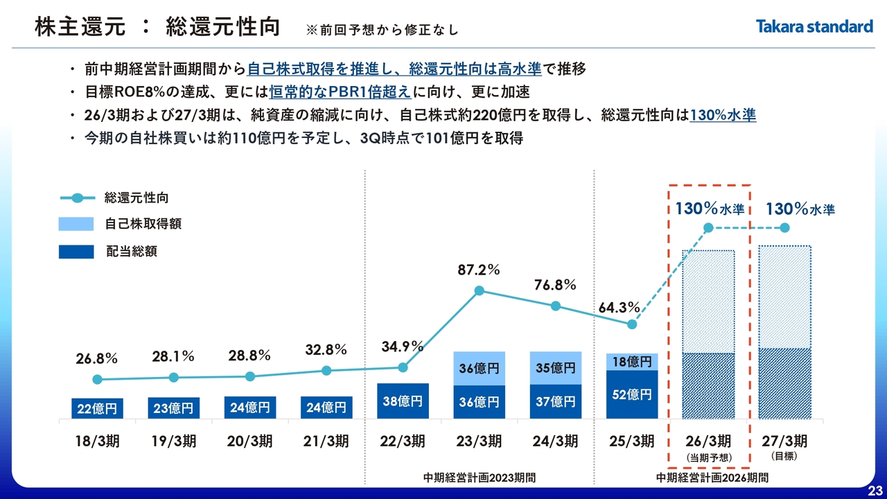 先ほどお伝えしたとおり、自己株式取得は今期・来期で約220億円を想定しており、総還元性向は130パーセント水準を予定しています。