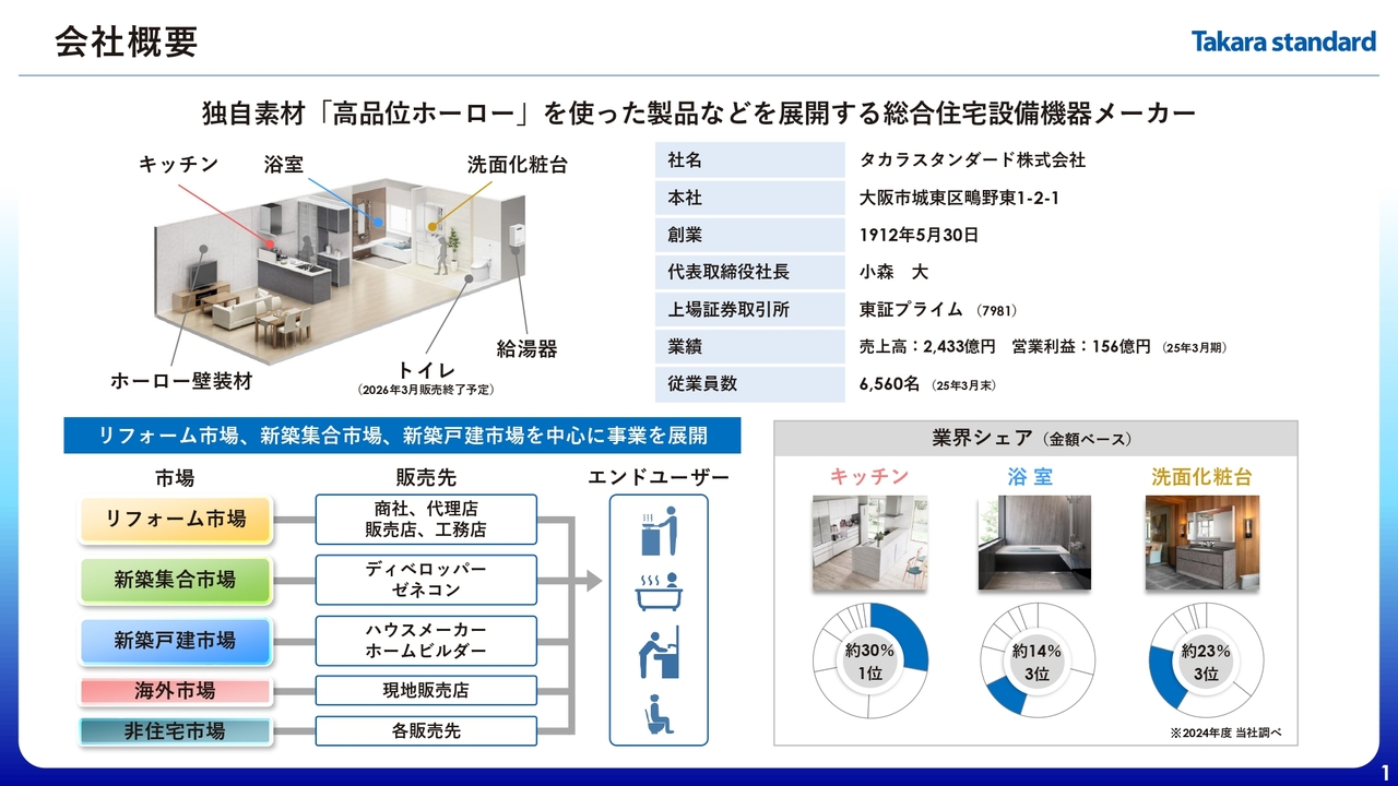 まずは、当社の概要について簡単にご説明します。我々、タカラスタンダードはホーローに特徴を持つ総合住宅設備機器メーカーで、キッチン・浴室・洗面化粧台が主力製品となります。