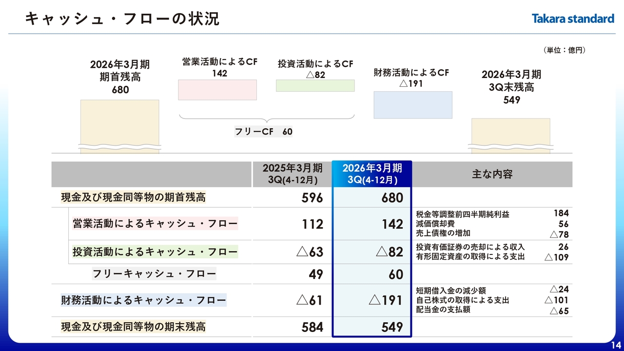 現金および現金同等物は減少していますが、こちらは先ほどの貸借対照表のご説明と同様、自己株式取得や増配によるものですので、想定どおりの推移となります。