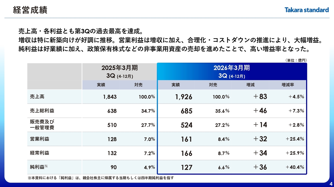小森大氏:みなさま、ご覧いただきありがとうございます。タカラスタンダード株式会社代表取締役社長の小森です。本日は2026年3月期第3四半期決算ならびに当期の見通しについてご説明します。