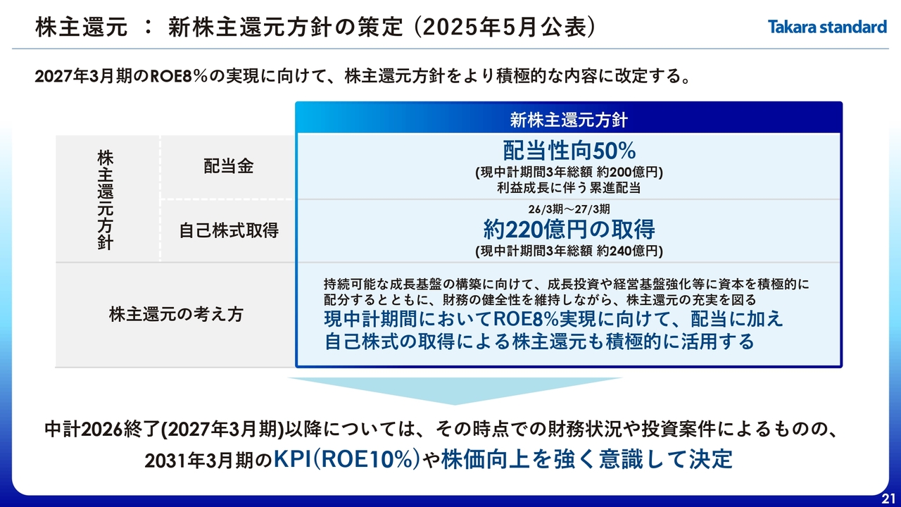 このような還元策を実施することで、現状過大と認識しているキャッシュポジションや純資産額を調整し、BSの適正化を進め、中計最終年の来期2027年3月期の重要KPIであるROE8パーセント達成を目指します。