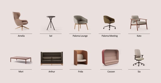 ラウンジシーティング(Amelia、Paloma Lounge、Kato、Arthur)、チェア(Paloma Meeting、Sia)、テーブル(Sol、Mori)、ワークブース(Frida、Cocoon)、収納など、幅広い家具を生産しています。