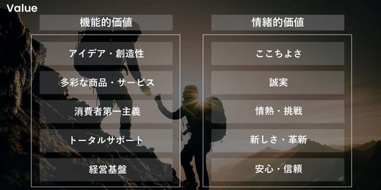 【機能的価値】『アイデア・創造性』『多様な商品・サービス』『消費者第一主義』『トータルサポート』『経営基盤』