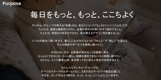 このたび策定したパーパス「毎日をもっと、もっと、ここちよく」は、この理念をより身近で実践的な言葉に置き換えたものです。