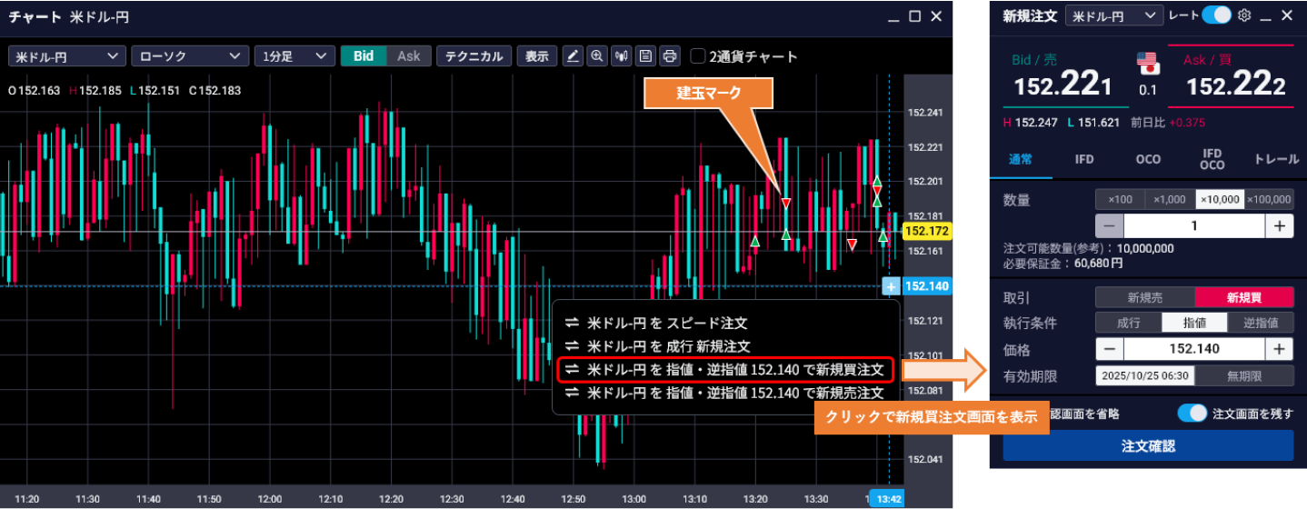 <建玉マーク表示機能とチャート上からの注文画面への遷移イメージ>