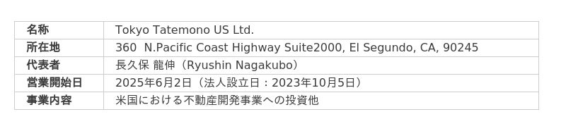 東京建物株式会社は、米国ロサンゼルスで現地法人「Tokyo Tatemono US Ltd.」の営業を開始しましたのでお知らせします。東京建物は2023年に参画した賃貸住宅開発事業「Herndon PJ」を皮切りに、全米の複数都市で賃貸住宅開発事業に参画し、2025年5月には東京建物として初となる米国物流施設開発事業「Silver Spring PJ」へ参画するなどアセットタイプも多様化も進め、現在8プロジェクトを推進しております。