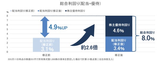 株主優待制度の導入及び期末配当予想の増配により、株主優待利回り及び配当利回り(修正後)を合わせた総合利回りは8.0%※となります。