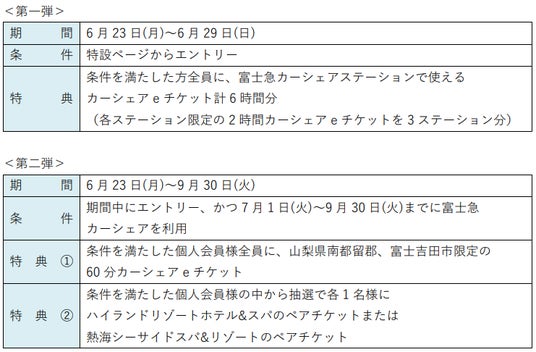 本サービスの開始にあたり、「『富士急カーシェア』スタートキャンペーン」を実施します。本キャンペーンでは、第一弾としてサービス開始前の6月23日(月)~6月29日(日)まで、特設ページからエントリーいただいた全ての方に、富士急カーシェア限定の「カーシェアeチケット(電子優待券)」をプレゼントします。第二弾では、期間内にエントリーかつ富士急カーシェアを利用いただいた方全員に山梨県南都留郡と富士吉田市エリア限定カーシェアeチケットをプレゼントするほか、抽選で各1名様にハイランドリゾートホテル&スパのペアチケットまたは熱海シーサイドスパ&リゾートのペアチケットをプレゼントします。