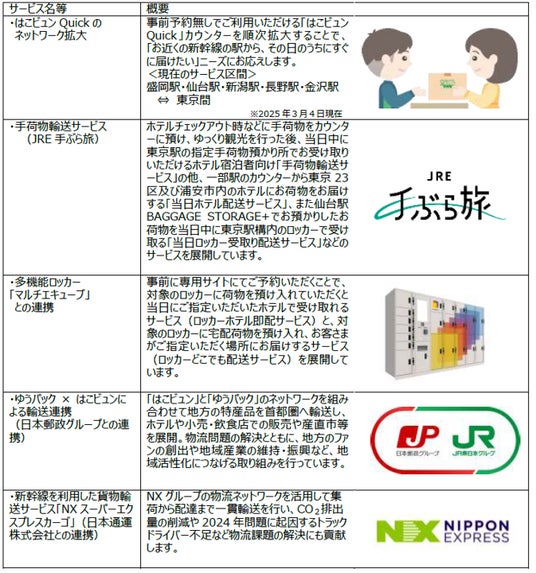 鉄道ネットワークを活用した荷物輸送サービス「はこビュン」は、JR東日本が運行する新幹線や在来線特急等と、荷物の積み下ろしや車内での管理などをJR東日本グループ企業が一体となり、グループで培ってきた列車輸送のノウハウを生かしてお客さまからお預かりした小口から大口のお荷物まで、高度な品質で輸送しています。また、事前予約不要で、荷物1個から、列車出発の30分前まで申し込み可能な 「はこビュンQuick」サービスを実施しています。