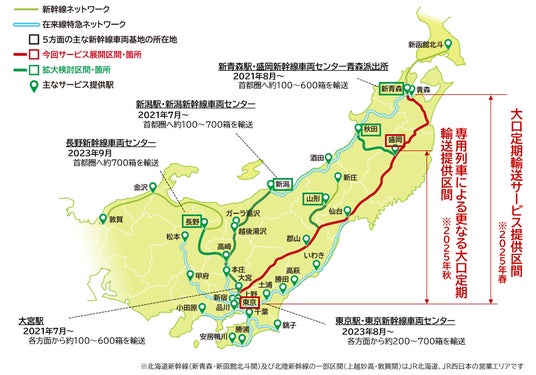 2024年度の多量輸送事業化検証結果等を踏まえ、現行の数箱から10箱単位の輸送サービスから、より多量かつ定期的な輸送サービスを開始します。将来的に、上越新幹線ほか対象線区・区間の拡大を図ります。