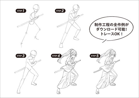 本書は基本的な立ちポーズから、描くのが難しい複数キャラクターのポーズまで、バリエーション豊かな100種類のポーズを掲載しています。感情表現やシチュエーションを意識したポーズを多数掲載しているので、これらのポーズを参考にすることで、より生き生きとした物語性のあるキャラクターイラストを描けるようになります。また、初心者の方でも安心して取り組めるよう、ポーズの骨組みとなるアタリの描き方から、立体的なアタリ、肉付け、細部の描き込み、仕上げまでの5つのステップを丁寧に解説しました。さらに、本書に掲載した5つのステップのすべての画像データを、JPEG形式と、レイヤーでまとめたPSD形式でダウンロードができます。本特典をトレースして、ご自身のイラストの下絵としてご利用いただけます。
